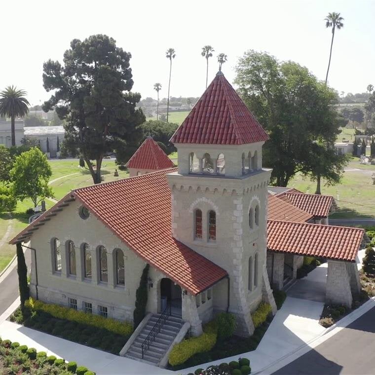 Our central landmark for over 100 years, the historic Grace Chapel, was constructed in the early days of the cemetery. Its completion was announced in the Los Angeles Times on October 30, 1907, and reported to be a 3/4 replica of a church in Edinburgh, Scotland. It is also said that it was named for Grace Grant (Williams) Loomis, the wife of the Cemetery’s first superintendent, Captain Lester G. Loomis. (Grace Chapel is in the process of retrofitting and renovations. Expected completion date is late Spring, 2019.)